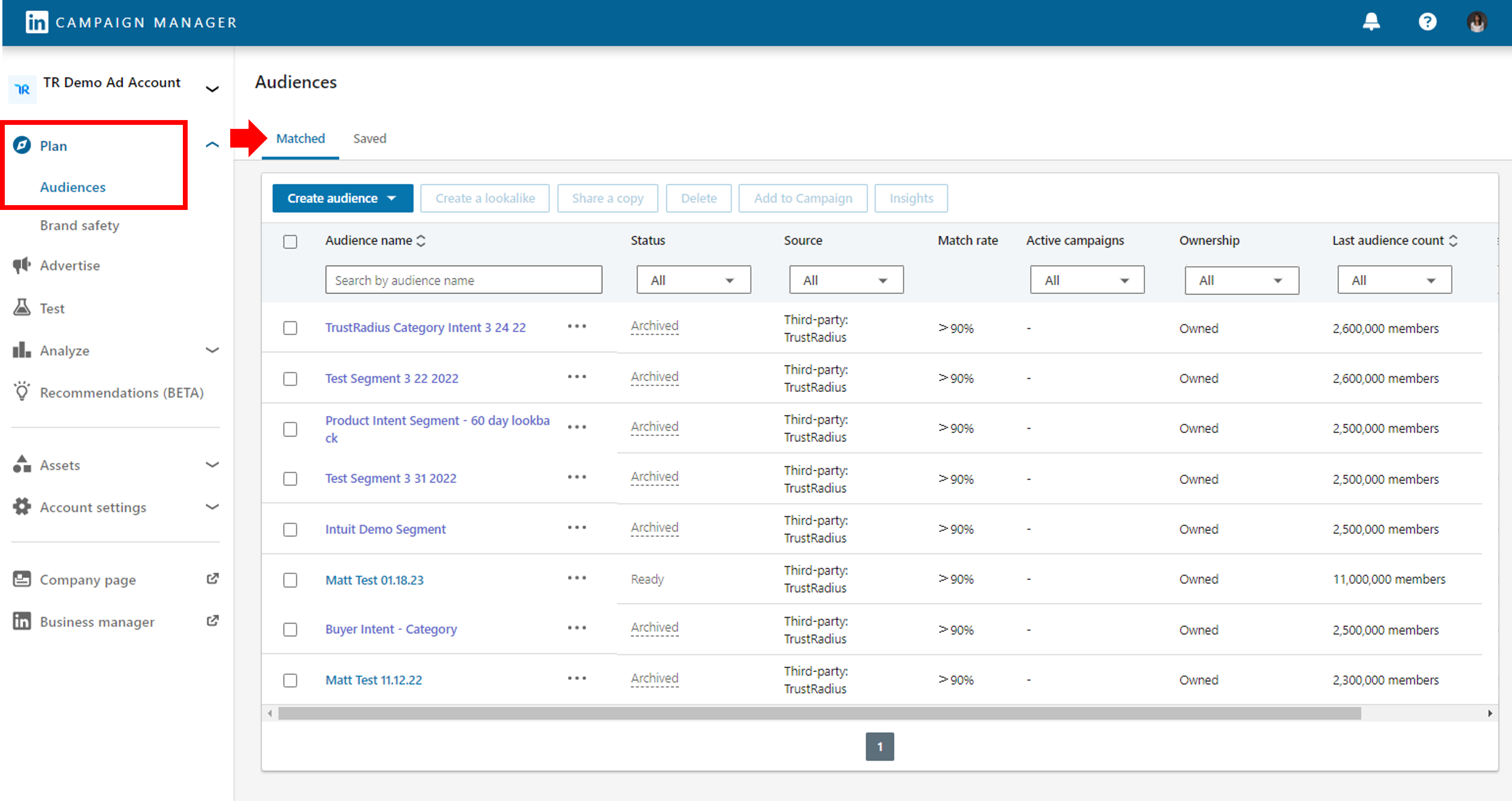 - Matched Audiences created through TrustRadius will be displayed with the text “Third Party: TrustRadius”