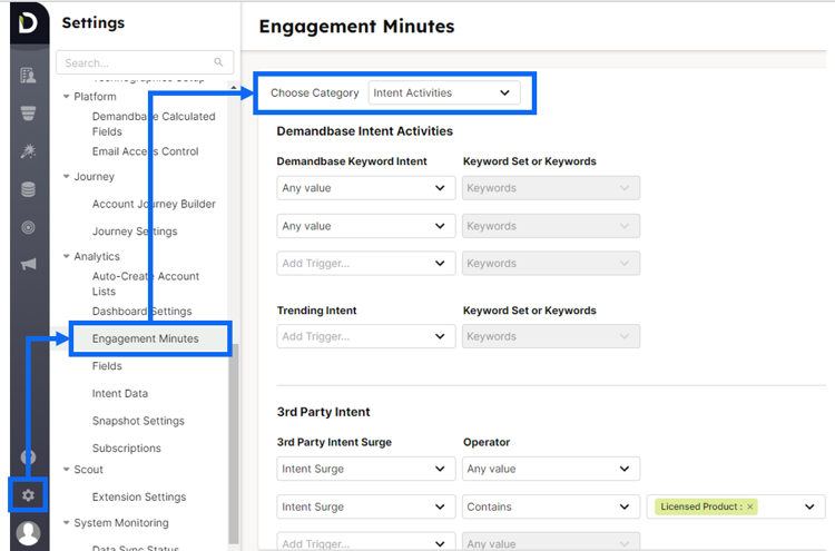 1. In the left-hand navigation bar of your Demandbase tenant, go to Settings > Analytics > Engagement Minutes.