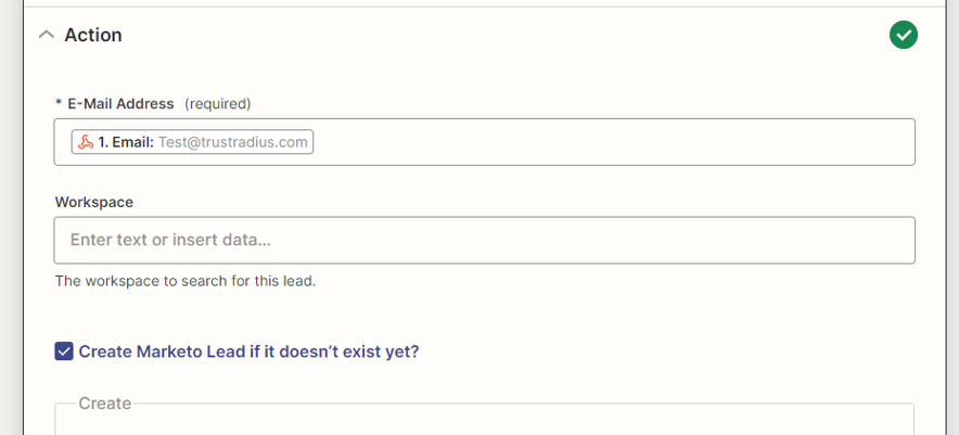 - In the Action section, click in the Email Address field and select “Email: Test@trustradius.com” from the dropdown menu. This tells Zapier which field from your TR lead form should be used to look up the lead’s email in Marketo.